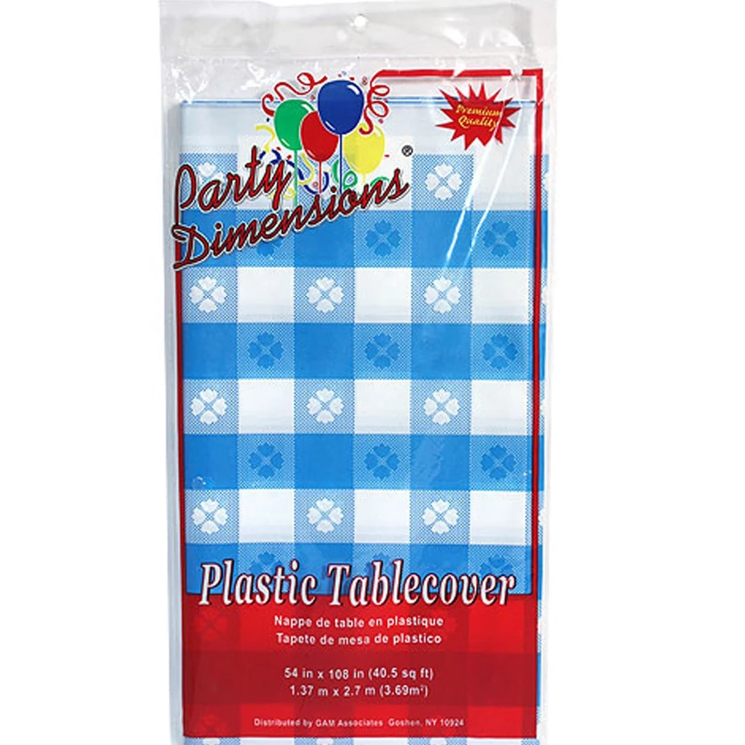 Party Dimensions Blue Gingham 54″ X 108″ Rectangular Plastic Tablecover, Single count. Designed for all occasions, banquets, dinners, parties, upscale catering and home.