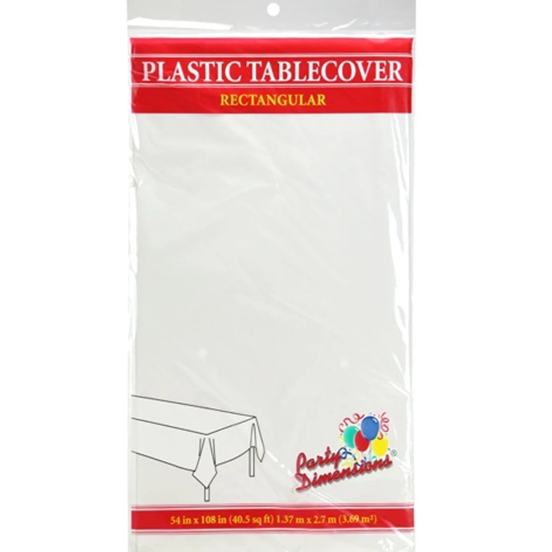 Party Dimensions White 54″ X 108″ Rectangular Plastic Tablecover, Single count. Designed for all occasions, banquets, dinners, parties, upscale catering and home.