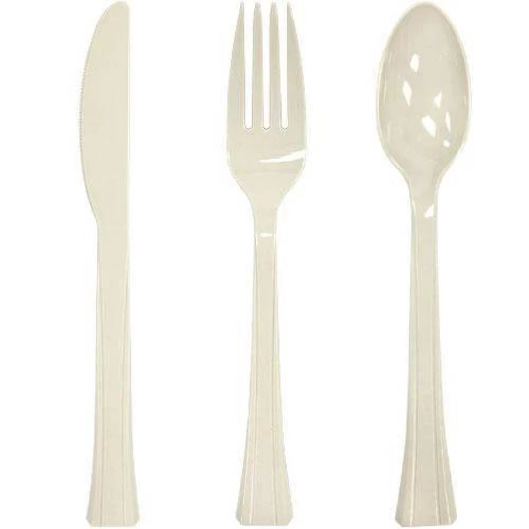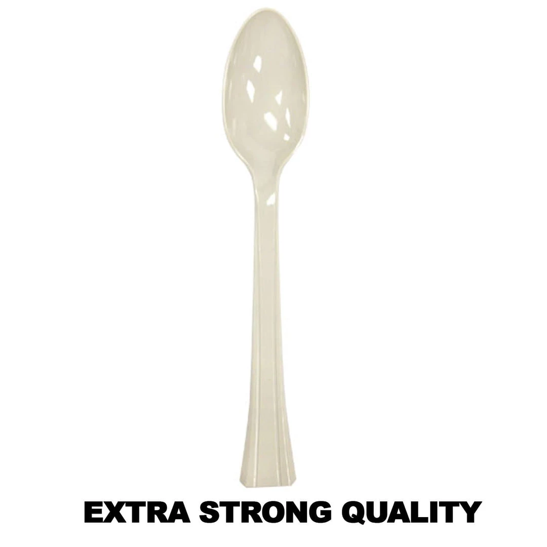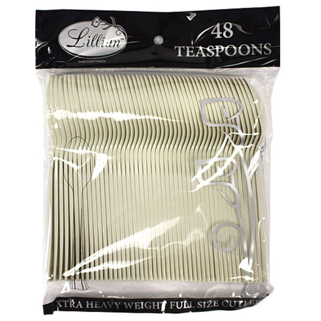 Lillian table settings Sahara premium plastic teaspoon 48 count. This cutlery can be purchased in matching bagged 48 count separates of fork, teaspoon, soup spoon, knife or 24 count combo. This style cutlery comes in 5 colors: clear, pearl (white), Sahara (off-white), gold and silver. Please view our whole Lillian table settings line for coordinating plates, bowls, napkins, serve ware and drink ware.