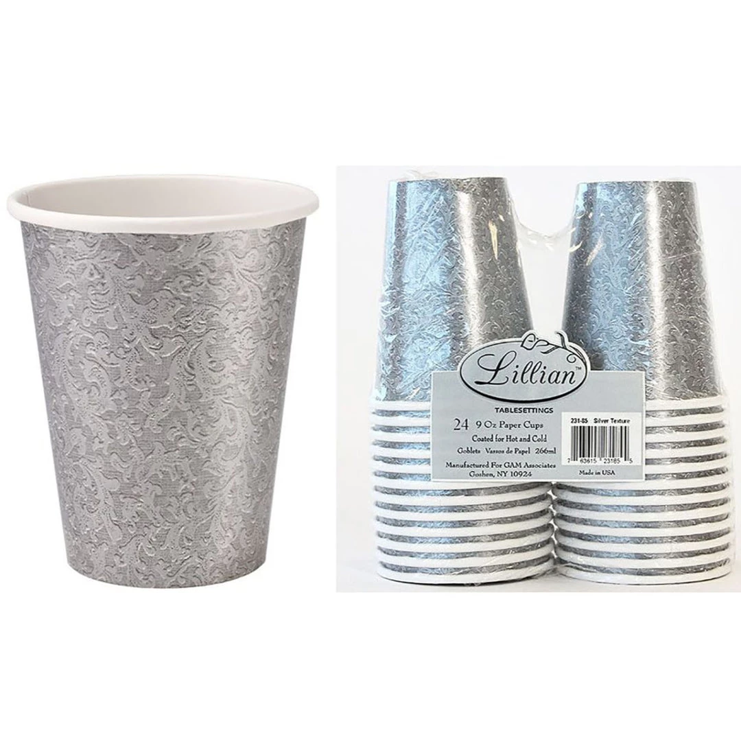 Lillian Silver Texture 9-Ounce Twin Stack Paper Cup, 24 pieces. Part of a set that includes 10″ & 7″ plate, 9-Ounce Cup, Luncheon, Beverage and Bistro Napkin. Textured Series comes in 9 Colors: Green, Purple, Silver, Gold, Cream, Burgundy, Blue, Orange and Pink. Designed for all occasions, banquets, parties, upscale catering and home. Disposable.